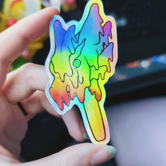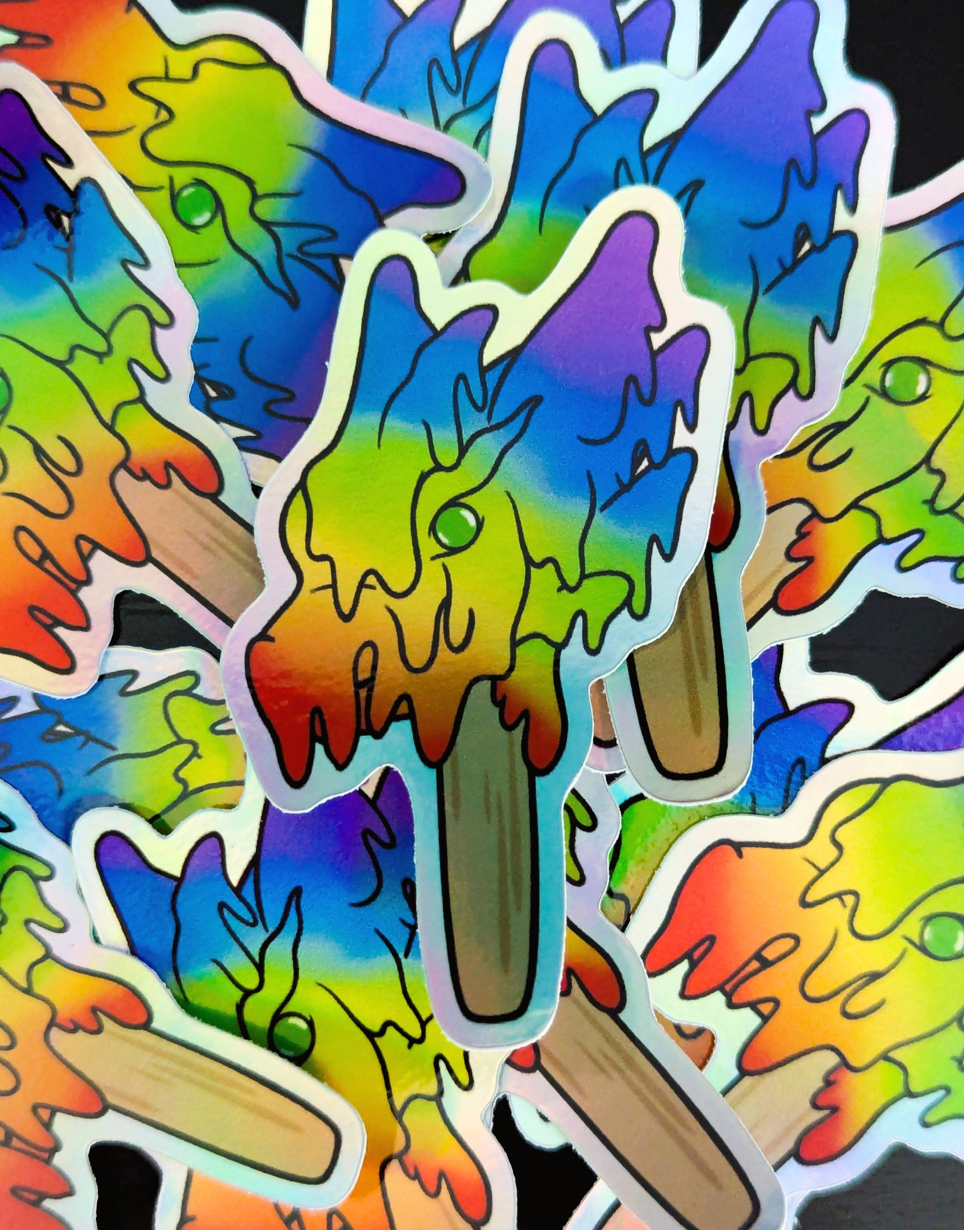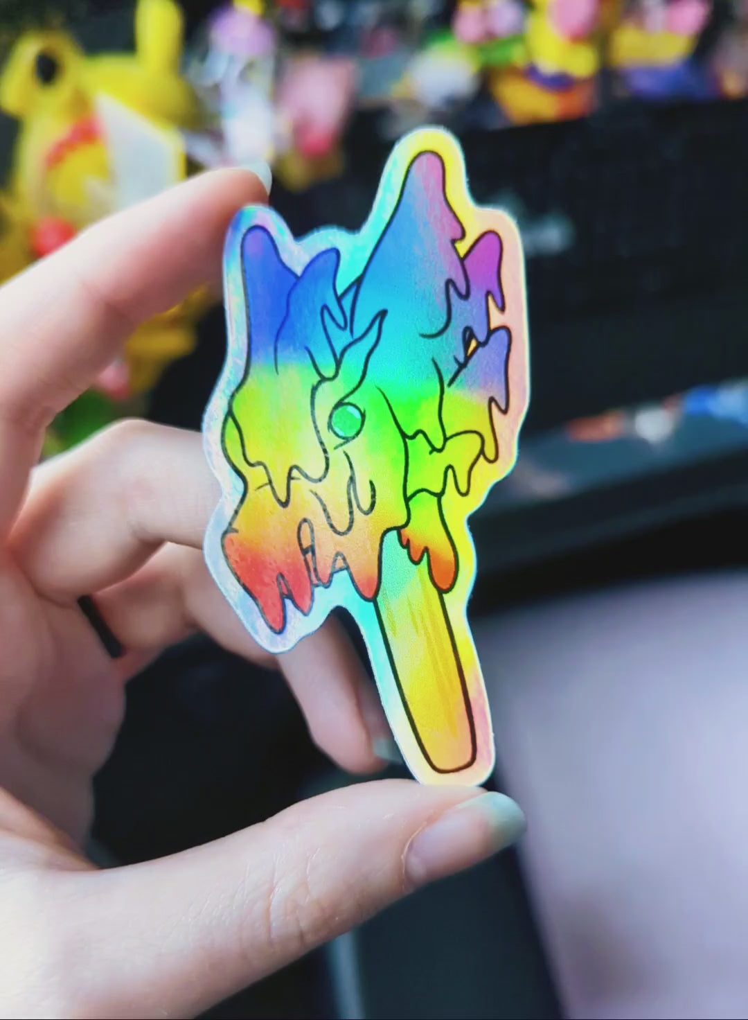 Holographic vinyl 2.5" dragon popsicle sticker. Complete with green gumball eyes and all the colors of the rainbow. What more could you need!